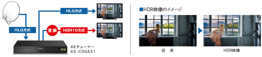 新4K衛星放送で採用されたHDRはHLG(ハイブリッド・ログ・ガンマ)方式です。HLG非対応(Ultra HDブルーレイやインターネットで配信される4K動画サービスのHDR方式「HDR10」に対応)の4K対応テレビと接続している場合は本機で「HDR10方式」に変換して出力できます。
