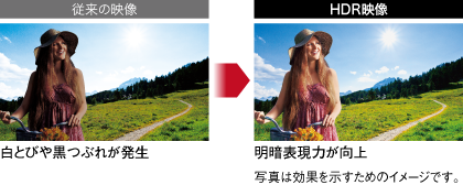 明暗表現力がアップする「HDR(ハイダイナミックレンジ)」に対応。奥行き感や質感をリアルに表現します。BS・110度CSの新4K衛星放送では出力方式に「HLG」(注1)を採用しています。