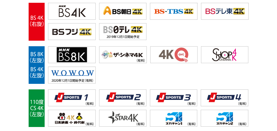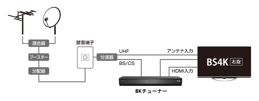 - ※2 新4K8K衛星放送とは、BS・110度CSの4K8K放送のことです。新4K8K衛星放送のご視聴には、本機のご使用に加えて、「SHマーク」のついた右旋・左旋円偏波対応のアンテナや混合器、ブースター、分配器などの機器、広帯域のケーブルなど、機器交換や工事が必要な場合があります。
