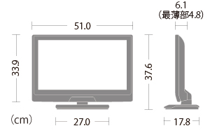 | 付属品 | ●ACコード(1.8m、取付済) ●テーブルスタンド(組立て式)(注12) ●ワイヤレスリモコン ●リモコン用乾電池(2個) ●B-CASカード ●転倒防止用部品(取付済)(注13) *アンテナケーブルは同梱しておりません。市販品をご使用ください。 |