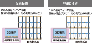 3D表示を行うために、従来は2本の信号ラインで液晶を高速駆動していましたが、FRED技術(注3)により1本の信号ラインだけで液晶を高速駆動させることに成功しました。液晶パネル内の配線や部品が少なく、光利用効率が向上したことにより、低消費電力で明るい映像を実現しました。