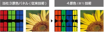 • (注2)4原色とは、当社独自のディスプレイ上の色再現の仕組みであり、色や光の3原色とは異なります。