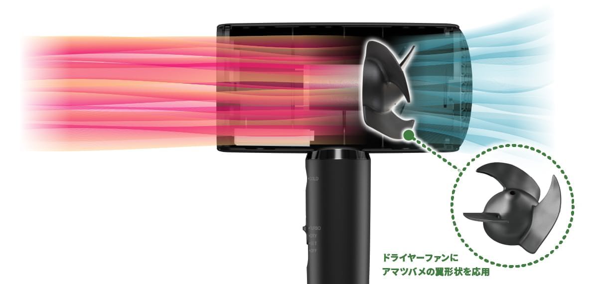 アマツバメの翼形状を応用したドライヤーファン。従来ファンと同じ大きさの直径6.3cmで、羽根の数は7枚から3枚に。