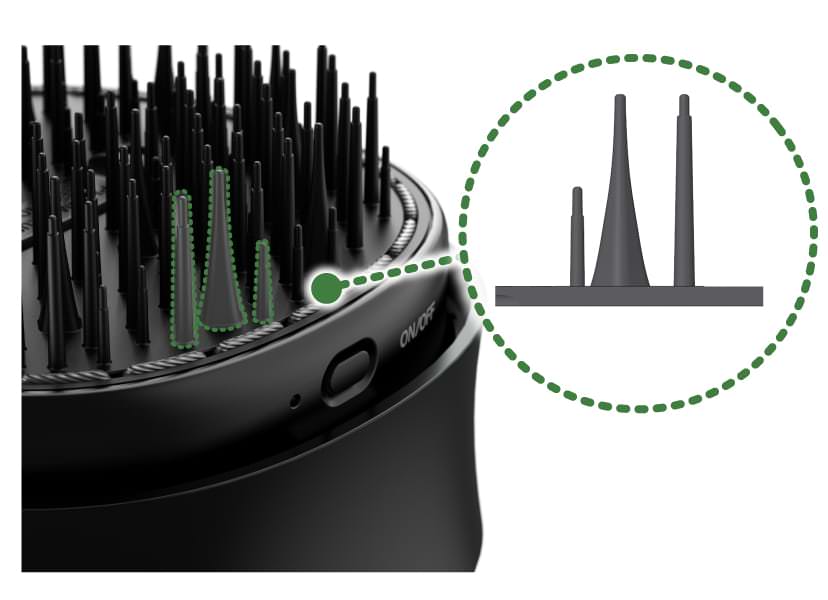 ピンは高さと形状の違う3種類を採用。先細り形状のピンはラッコの爪をヒントにしています。先細りの先端が髪の絡まりに突き刺さり、押し広げることで髪をほぐすことができるという、原理です。