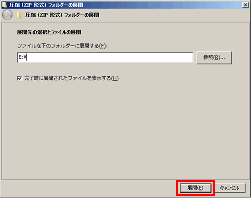 1.3 展開先として、USBメモリーが認識されたドライブ(Eドライブ)を指定し、[展開]ボタンをクリックします。