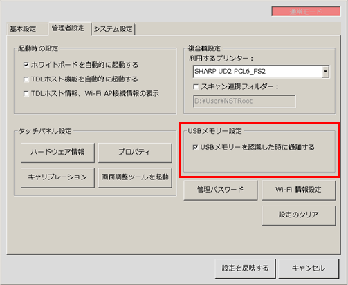 2.3 USBメモリー設定の項目で「USBメモリーを認識したとき自動的に通知する」を有効にします。