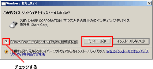 以下の画面が表示された場合は「”Sharp Corp.”からのソフトウェアを常に信頼する」にチェックし、[インストール]ボタンをタッチします。
