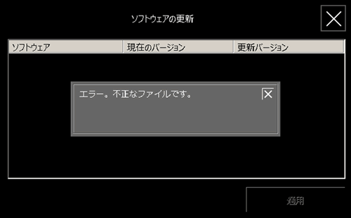 更新用のファイルに不正なファイルが含まれている場合は、以下の画面が表示されます。×ボタンをタッチすると、アップデート情報の画面を終了します。