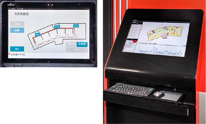 (左)タブレット端末でAGVの呼び出し、行き先の設定が簡単にできる