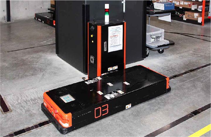 2018年4月導入。カゴ車や台車の下に潜り込んで牽引するタイプと、パレットを積載したハンドリフトを牽引するタイプの2種類を商品の自動運搬に活用。