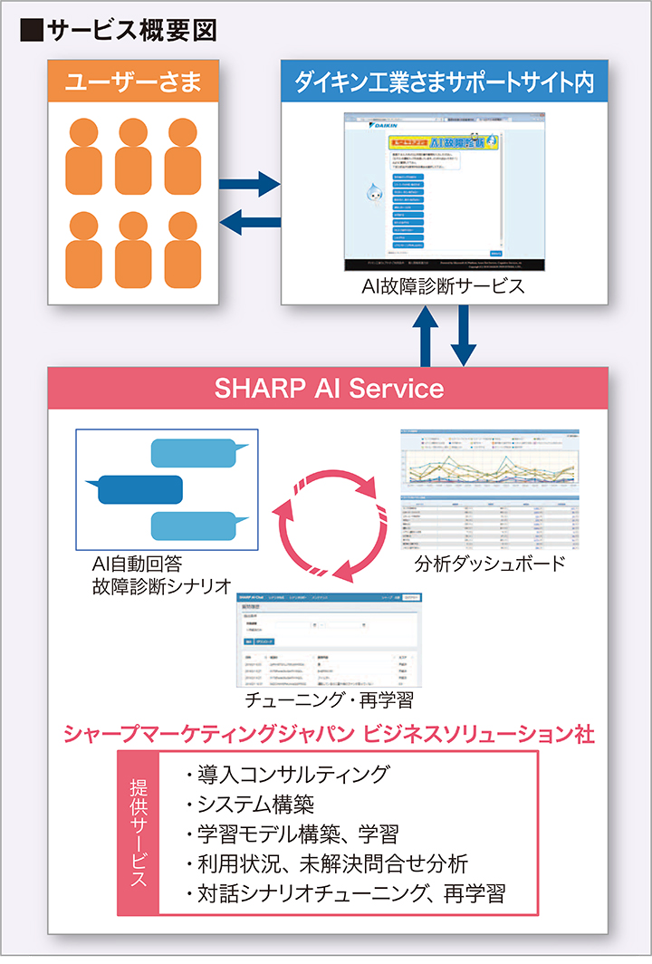 - シャープの故障診断シナリオ制作のノウハウや利用ログ分析による継続的なAI学習支援に満足。
