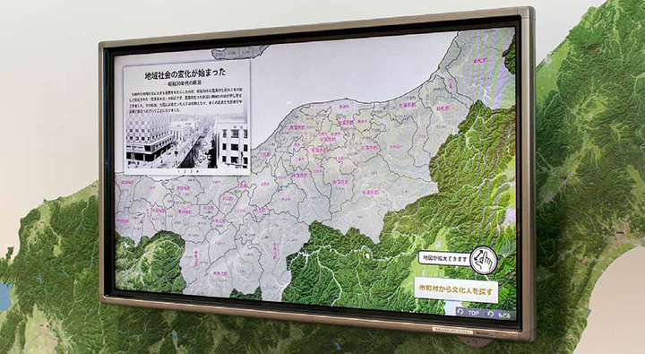 70V型BIG PADは、広いホールの壁一面に表示した日本地図の新潟県部分に設置し、市町村名をタッチすると郷土ゆかりの文化人情報を表示。また20V型タッチディスプレイは、展示コーナーのテーマ・分野ごとに1台ずつ配置するなど計7台導入し、パネル展示された全国の文化人との相関関係図などと照らし合わせながら理解を深められるようになっています。いずれも操作は画面上のアイコンをタッチするだけなので気軽に使え、子供から高齢者まで積極的にご利用いただいており、文化人に対する理解も深まっています。