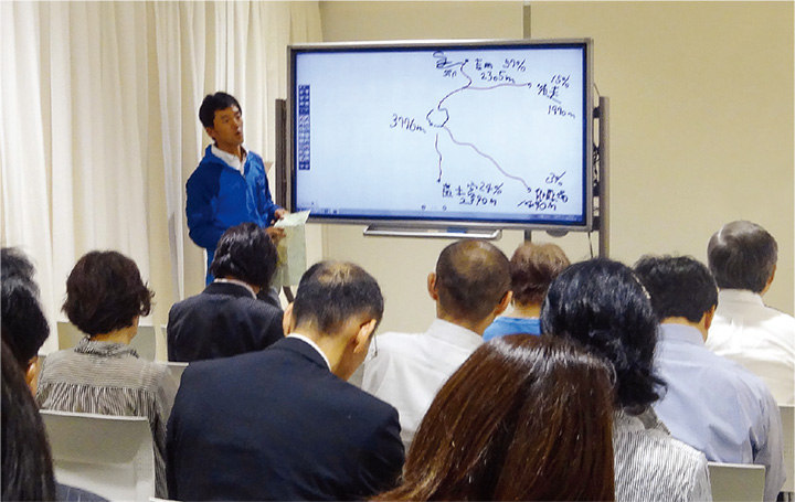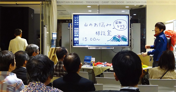 これまでセミナーでは、登山家の講師が山で撮影した風景など、L版の写真で回覧していましたが、当店ではBIG PADに映し出せるので、臨場感のある講義が実現しました。また、セミナールームが明るいままで使用でき、隣接する売り場に影響を与えないことも大きなメリットです。