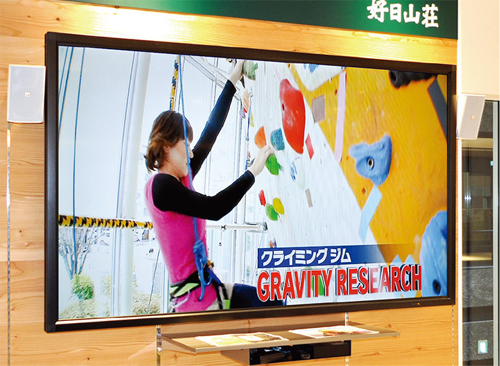 ショップの上階には、ロッククライミングが体験できる「クライミングジム」を併設しています。BIG PADはキャスター付きなのでジムに移動し、クライミングの映像を映すことで、参加者のスキルアップに繋がるサービスも検討しています。今後もこれまでにない斬新な店舗作りに、BIG PADと80V型ディスプレイを活用していく予定です。