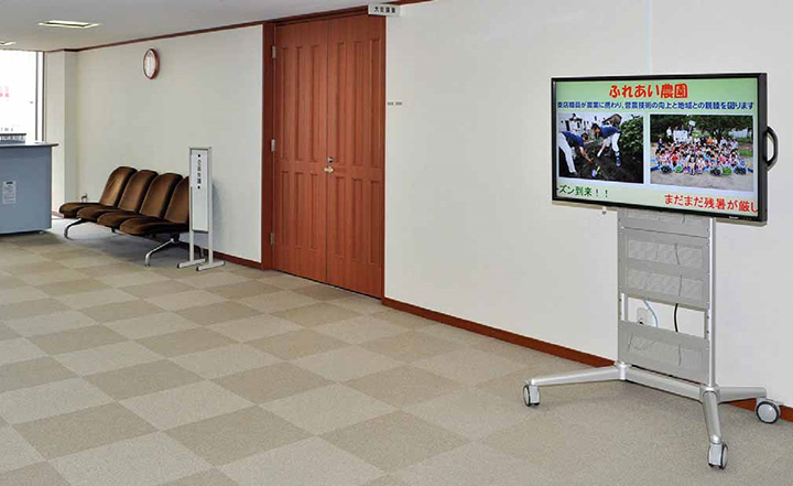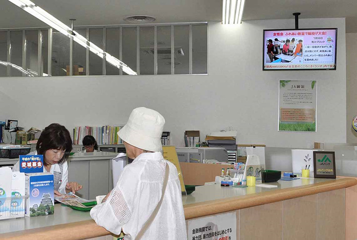 2013年7月に全62支店の窓口と直売所全8ヵ所などに導入完了。コンテンツは広報課から配信。