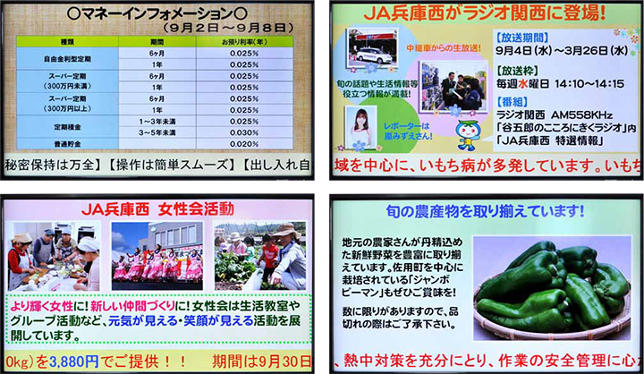 金利・イベント報告・直売所情報などを10~15秒ごとに表示