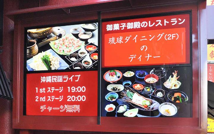 また土産店がひしめく「国際通り」ではまだ珍しい、120V型相当の4面マルチの設置で、店舗が一段と目立つようになり、当社のイメージアップも図れました。