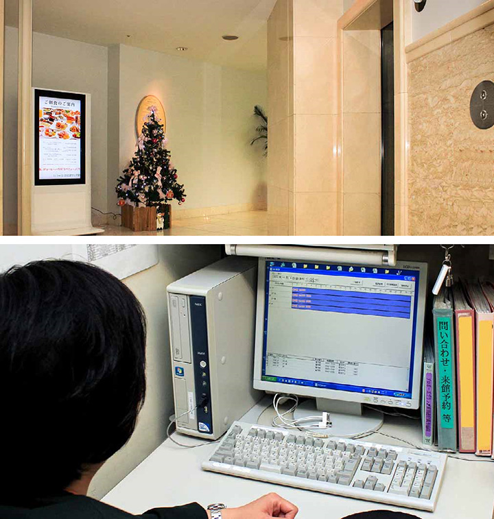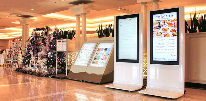 2013年3月、1F~3Fに計9台導入。レストランや宴会場の案内表示として活用。案内表示には、ホテル向け宴会予約システムと連動した表示システム「BV Signage」※を採用。