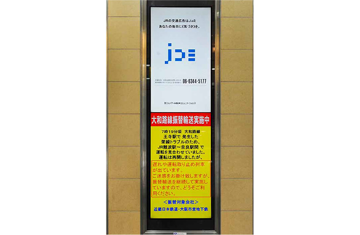 運行異常時には下段に振替輸送情報などを表示(JR天王寺駅)