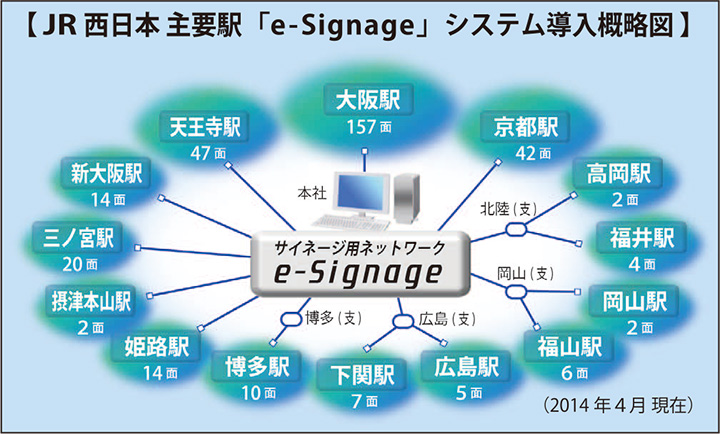 - 京都、大阪、三ノ宮、姫路など、関西エリアの主要駅のディスプレイをe-Signageで結び、大阪本社で運営管理。