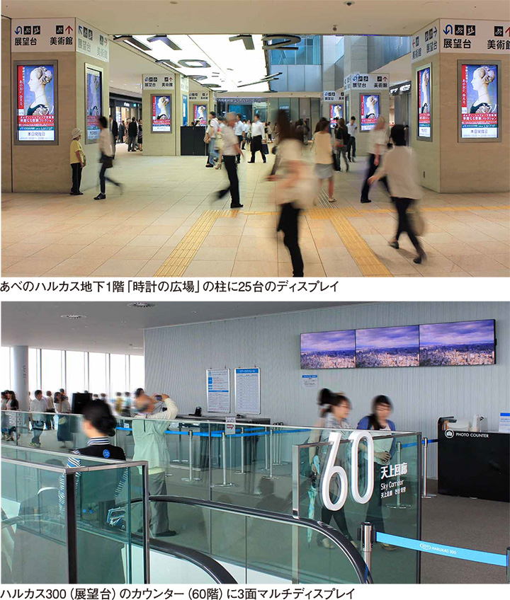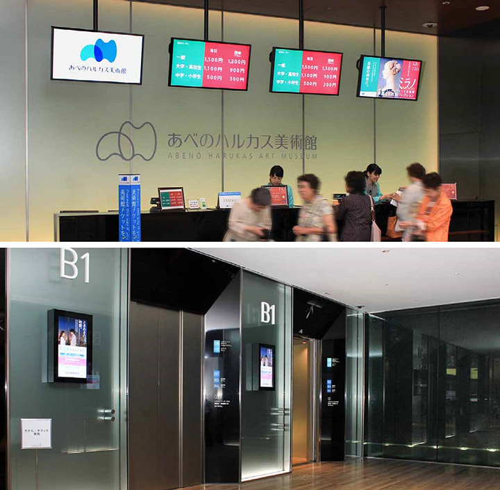 2013年6月より、あべのハルカスのオープンに向けて順次導入。地下1階「時計の広場」の70V型25台を始め、ビル内の様々な場所へ合計71台を設置。
