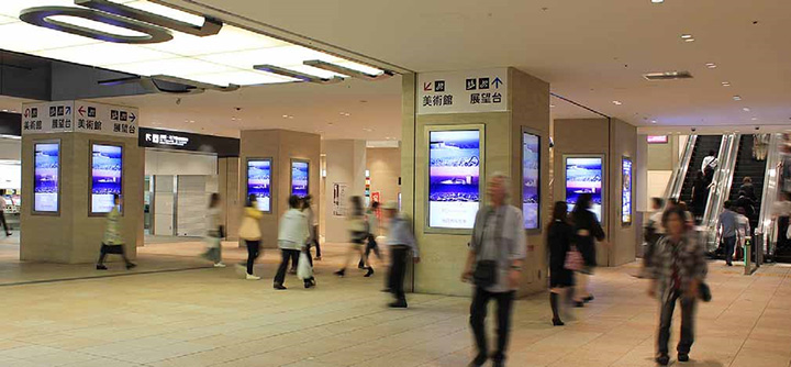 高さ300mの超高層複合ビル「あべのハルカス」は巨大な集客施設です。展望台や美術館、ホテルや百貨店などを始め、入居テナント様の広告や案内表示を中心に、効果的な情報発信を行いたいと考え、デジタルサイネージに着目しました。