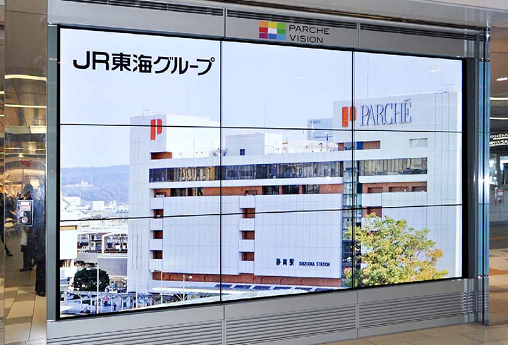 2014年10月、運用開始。静岡駅のコンコースに面する駅ビル・パルシェの1階入口に、9面マルチディスプレイとして設置。