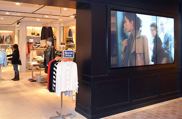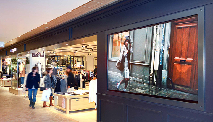 2013年に発足した当社の新ブランド「LE JUN」では、大人のコンフォートなライフスタイルを実現する、様々なファッションアイテムを提案しています。こうしたブランドのコンセプトを店頭でお客さまにお伝えするのに、静止画のポスターを使うと一つのイメージに限定されてしまうため、様々なアイテムを次々に紹介できるデジタルサイネージによるアピールを考えました。