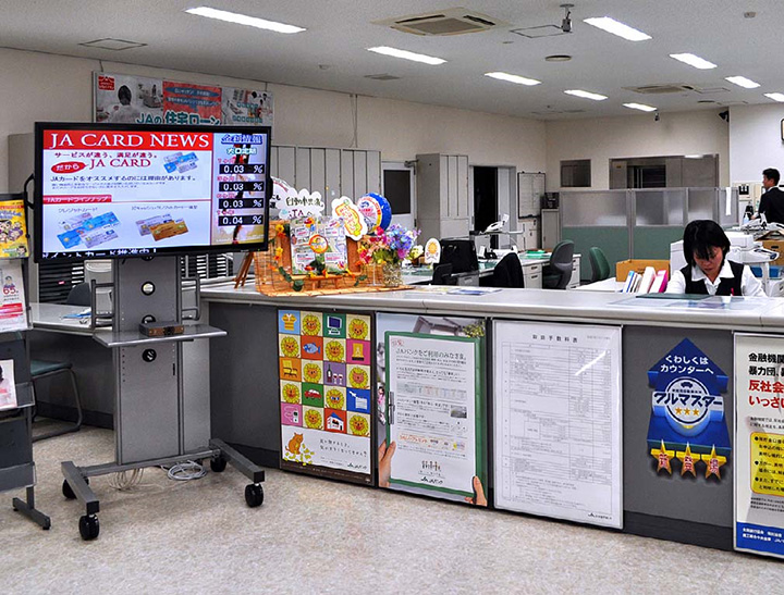 導入したインフォメーションディスプレイは、営業時間の午前9時から午後3時まで使用しています。コンテンツはJAのシステム管理を行う部署が作成し一括配信するので、各支店における金利更新の手間がなくなり、表示ミスを防がなければならないという精神的負担も解消されました。