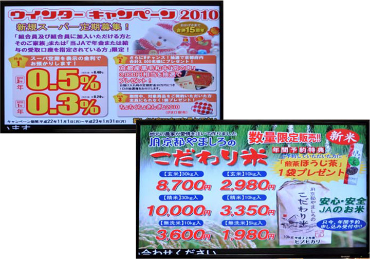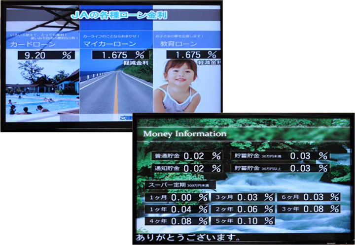 コンテンツには「スーパー定期」「マイカーローン」などの金利情報のほか、「JA共済のお知らせ」「農産物の商品情報」など金利以外の情報も盛り込んで、お客さまに様々な耳寄り情報をお届けできるというサービスが実現しました。また大画面で高精細なディスプレイはお客さまの目に留めていただきやすく、フロアもぐっと華やかに演出できています。