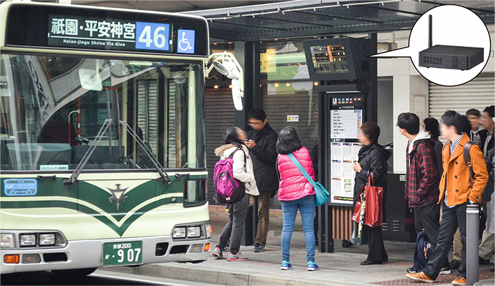 2015年9月より順次導入し、今後200台程度まで導入予定。京都市バスの停留所に設置されたディスプレイに接続して画面をコントロールする。