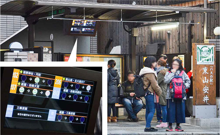 屋根やベンチとともにバス接近案内システムを設置し、「バスの駅」として整備された東山安井停留所