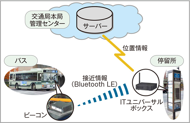 ITユニバーサルボックスは、ビーコンからのBluetoothの電波信号と、管理サーバー経由で送られてくる遠隔地のバス位置情報を処理して画面のコンテンツを更新でき、筐体も小型で停留所の標柱の中に収められます。また、これまで当局ではスマートフォン用バス接近案内アプリを提供してきましたが、ITユニバーサルボックスのOSもAndroidであるため、既存のアプリの資産を有効活用でき、短期間での開発が可能で費用を抑えられるのもメリットでした。