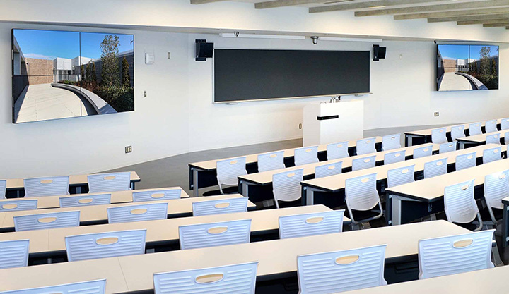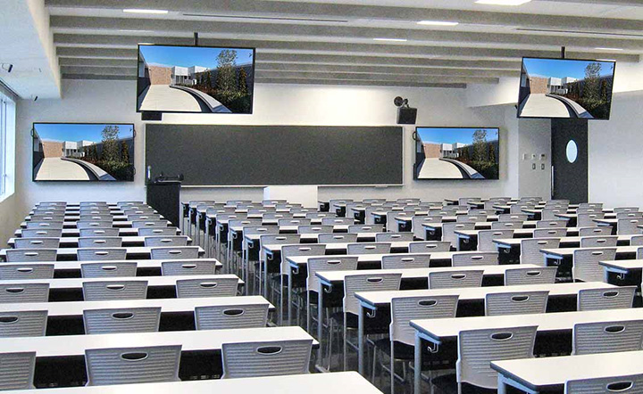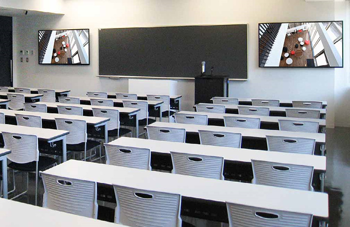 奥行きのある中教室では、80V型2台を黒板の両サイドに壁掛け設置したのに加えて、60V型2台を天吊りで設置