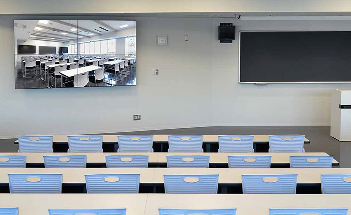 約200人収容の教室に設置した2セットの4面マルチは、プロジェクターとほぼ同等サイズの110V相当の大画面で、実習風景などの映像資料がより鮮明に見やすくなりました。明るい教室内で使えるので黒板と併用でき、学生に負担をかけることもありません。この新しいディスプレイを使うことで、普段の授業に加え他大学との遠隔授業、また学会等の研究活動、講演会等も行えます。また大画面マルチが2セットあることから、学生がそれぞれ用意した資料を映してディベートを行ったり、同じ題材の映像を同時に映して、表現の違いを比較するなど、活用法も多彩に広がります。