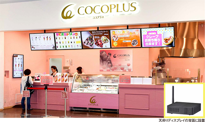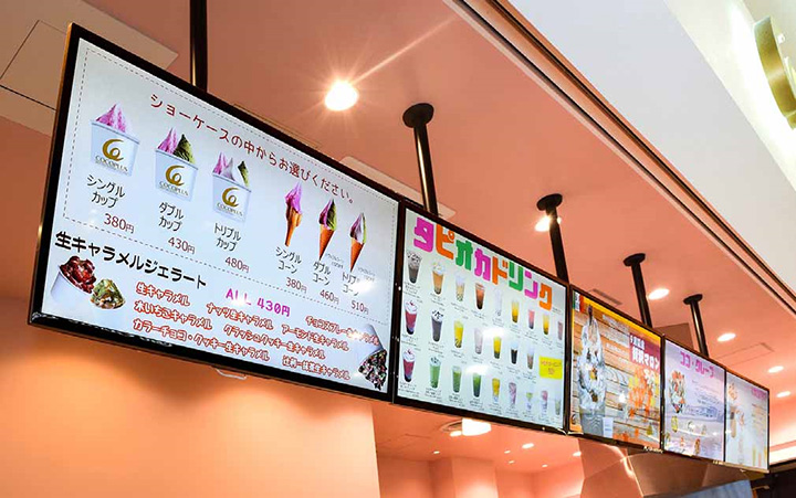 ショッピングモール内にジェラートショップをオープンすることになり、商品メニュー表示用に、天吊り設置で5台、レジ横に壁面設置で1台のディスプレイを設置することになりました。当社は主な事業として携帯ショップを運営しているため、ショップ向けのサイネージ配信用Androidアプリを開発しており、これを有効活用できるAndroid OS 搭載のディスプレイ制御機器を探していました。