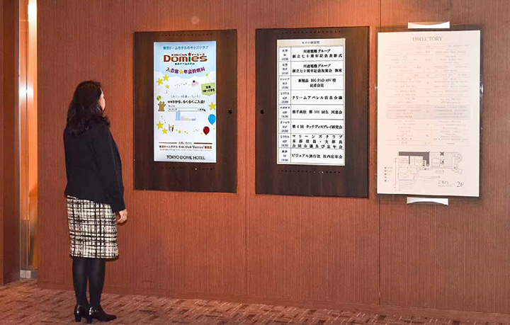 1階ロビーや2階通路では壁面に、宴会場フロアでは移動式筐体に格納して設置。案内表示には、ホテル向け宴会予約システムと連動した「BV Signage」※を採用。