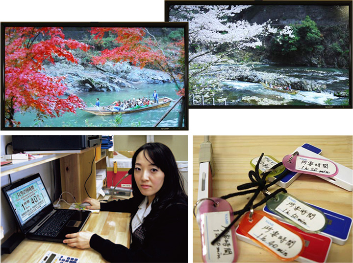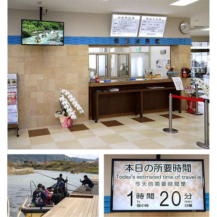 以前から、待合所では川下りの所要時間と乗船までの待ち時間を表示しています。所要時間は、川の水位が安定していれば頻繁に変更しないですむものの、紅葉の季節などの混雑時には待ち時間が2時間以上になることもしばしば。こまめな更新が不可欠なため、職員がその都度、表示札を差し替えに走り、手間がかかっていました。また、「保津川下り」の映像も提供できれば待ち時間も楽しく過ごしていただけると考え、最新のディスプレイの導入を決めました。