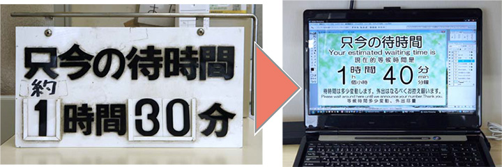 - 所要時間・待ち時間の変更の度に表示札を差し替える手間が省け、事務の効率化が図れました。