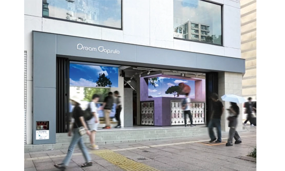 当社はカプセルトイ専門店を全国の商業施設等で展開しています。2024年12月には、商品約700種を取り揃えた旗艦店を名古屋の中心部にオープンしました。店舗前に緑豊かな公園が広がることから、自然との共生をコンセプトに店舗を演出することを決定。白いプラスチック製のカプセル自販機が並んで無機質な印象の店内で、季節感のある映像をプロジェクションマッピングで映して、お客さまが楽しめる空間を作ろうと考えました。