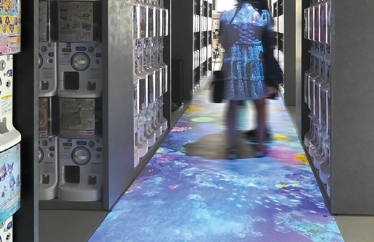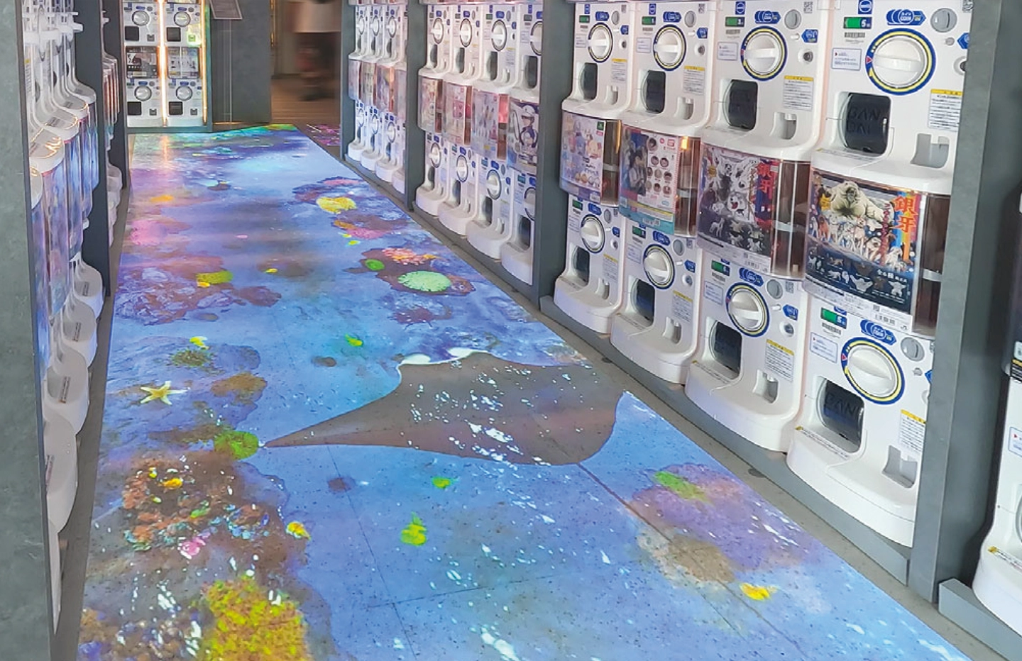 海の中で魚やウミガメなどが泳ぐ映像など、自然を感じられる映像を床面に映して店内を演出しています。来店客にはここでしか味わえない非日常の異空間を楽しんでいただけており、プロジェクションマッピングの映像とカプセルトイの商品を一緒に撮影してSNSにアップする方も多く、それを見た方が来店するきっかけにもなっています。また海外からの観光客に日本のサブカルチャーの魅力を発信することにもつながって、集客効果が高まっています。