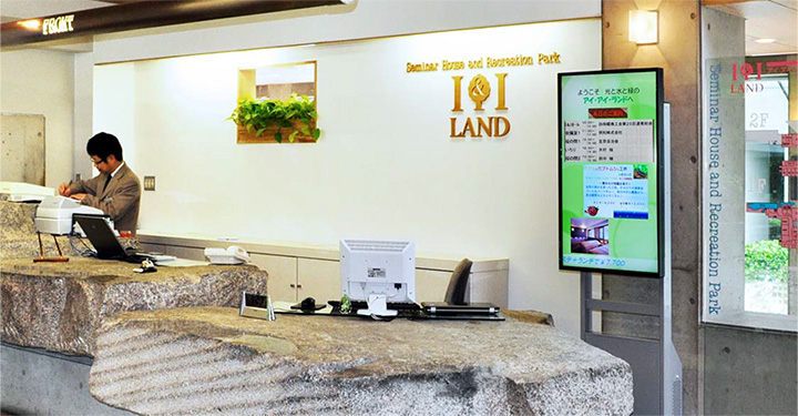 豊かな自然に囲まれた当館は、自然光をふんだんに取り入れる設計になっています。従来の看板は輝度が低かったため、外光が届きにくいフロントの背面の壁に設置していましたが、フロントスタッフの影になり、お客さまにとって見辛さがありました。今回導入したディスプレイは700cd/m2で十分な輝度があるので、照度の高いエントランス正面に設置することができ、伝えたい情報をお客さまにしっかりとアピールすることが可能と考えました。