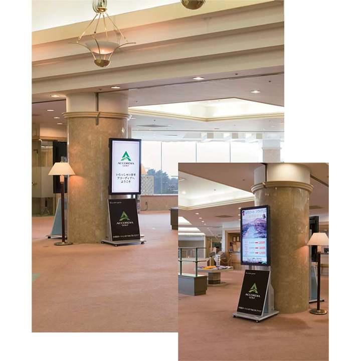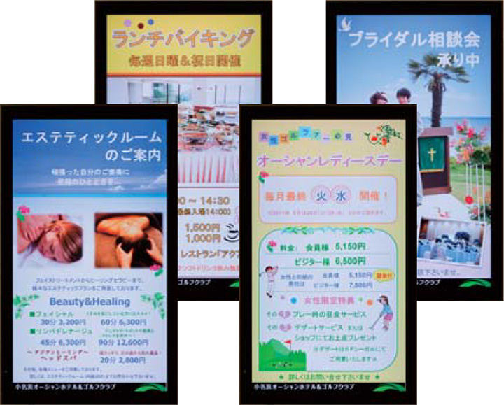 ホテルやゴルフ場の各種プランやイベント、レストラン情報など告知したい内容が多彩にあります。しかし、紙のポスターで掲示すると雑然としてしまいホテルのグレード感を損なうなどの理由から、十分なインフォメーションができていませんでした。