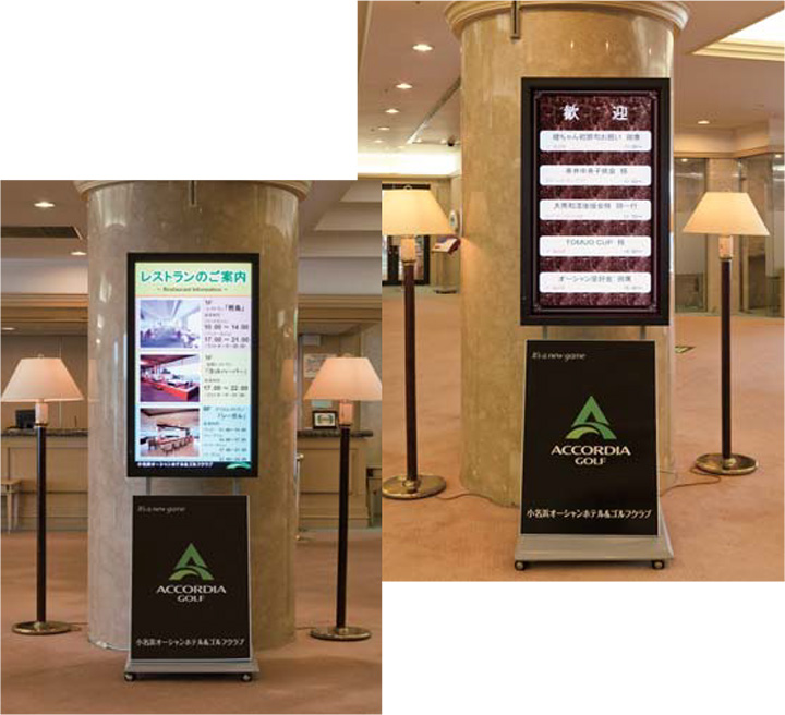 2010年7月、1Fロビーに2台設置。「本日のご宴席」表示用の1台を玄関向きに、プラン等の情報告知用を内側のエレベータ向きに設置。