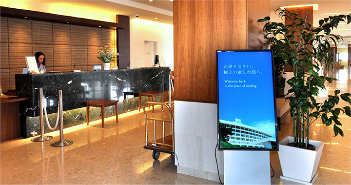 ディスプレイの導入検討中に、ご販売店である沖縄アスコンさまが開催したサイネージ展示会に参加し、具体的な商談に入りました。商談では、実機をホテルに持ち込んで、当ホテルオリジナルのコンテンツをデモストレーションしていただいたことで、設置後のイメージがぐっと鮮明になりました。また32v型のディスプレイは移動可能のスタンドがついた電子看板として、可動性に優れるため、必要な時に必要な場所に移動しやすい点を高く評価しました。