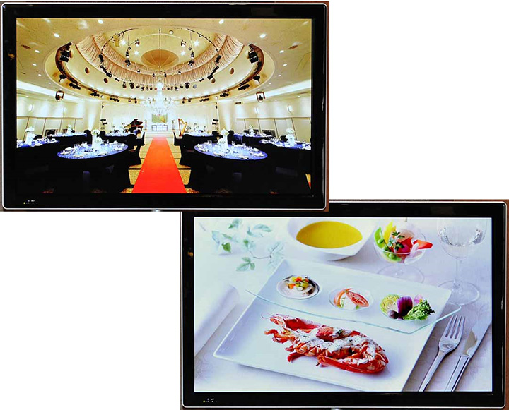 コンサートなどで大勢のお客さまが来場される際、当社ウエディング商品のPR映像を表示。高い再現性で魅力的に紹介でき、ご利用客作りに繋がっています。32v型は手軽に移動できるので、必要な会場前に運び、サインボードとして活用しています。