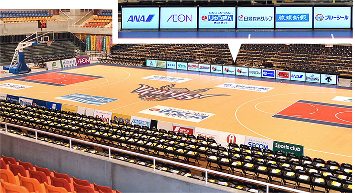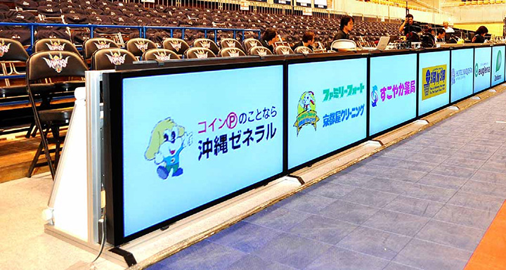 デジタル化で、1画面に次々と企業名を紹介することができ、オフィシャルスポンサーだけでなく、小口スポンサーの紹介も実現。動きのある表示で目に留めてもらいやすくなりました。またマルチディスプレイなので移動・設営が比較的容易で、那覇市、宜野湾市など各試合会場に持ち込んで活用しています。
