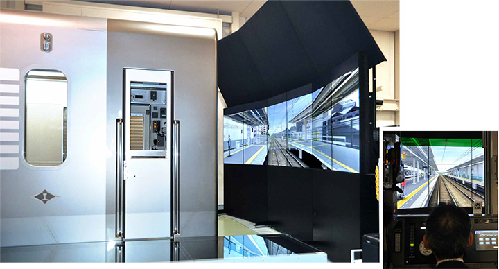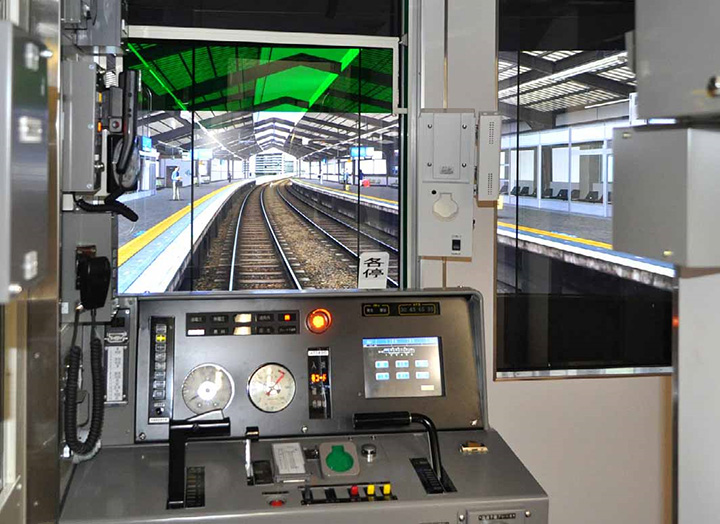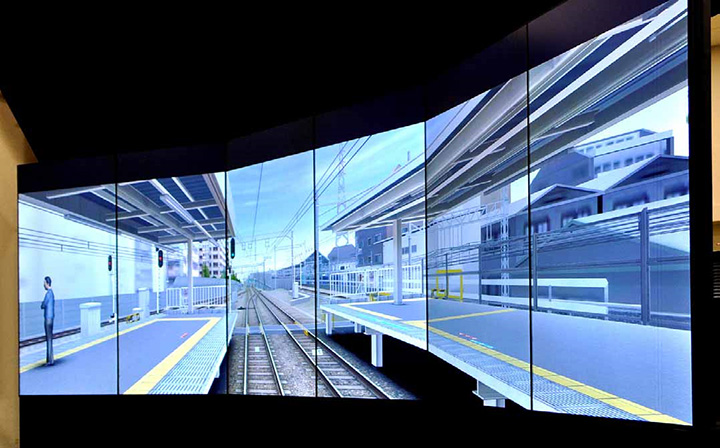 照明を落とす必要がないので、実習生はメモを取りやすく、教官も見習生の動きをチェックしやすくなりました。ディスプレイには通常運行だけでなく、地震や火災などの映像も映し出し、緊急時対応でも臨場感のある訓練が実現。また車掌用シミュレーターでは4面マルチで列車到着から発車までの映像を再現し、乗務員の技能向上に繋げています。
