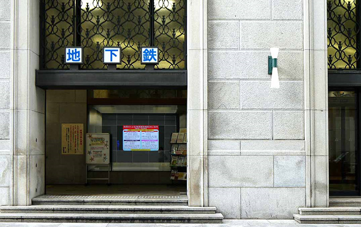 地下鉄から地上への階段を上りきったライフプラザ本店入口横に設置された60v型ディスプレイ