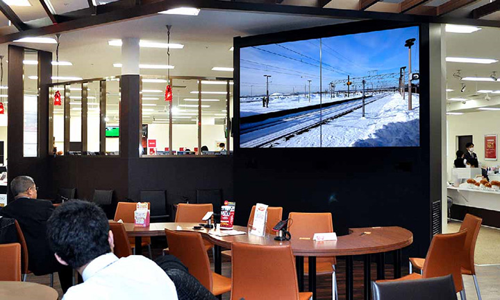 2012年1月の店舗リニューアルを機に導入。ポスター掲示の代替用として42v型を8台、動画配信用として47v型2面を4カ所に設置。